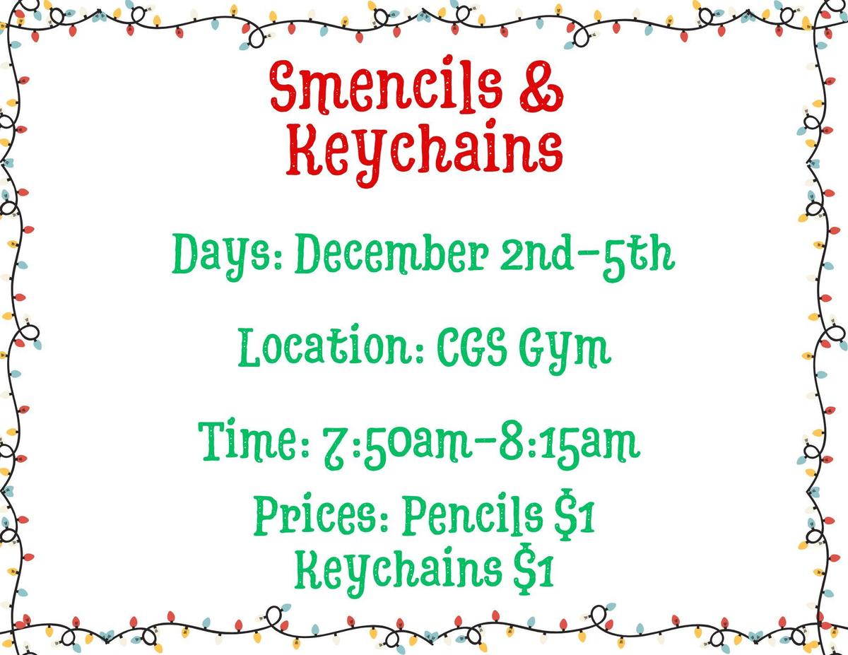 Central Grade School students will have the opportunity to purchase Smencils and Keychains for $1 each between December 2nd and December 5th. Just head to the CGS gymnasium between 7:50am and 8:15am to make your purchase from a Student Council member.